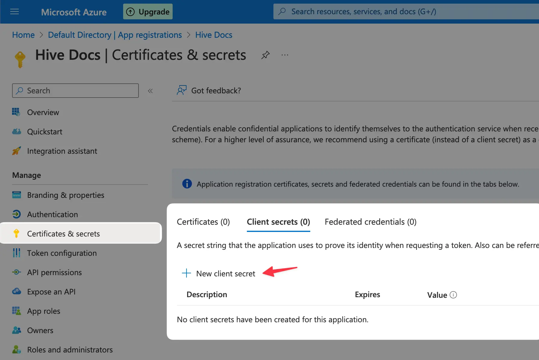Now, reate a new client secret for your app by navigating as the screenshot illustrates then on the